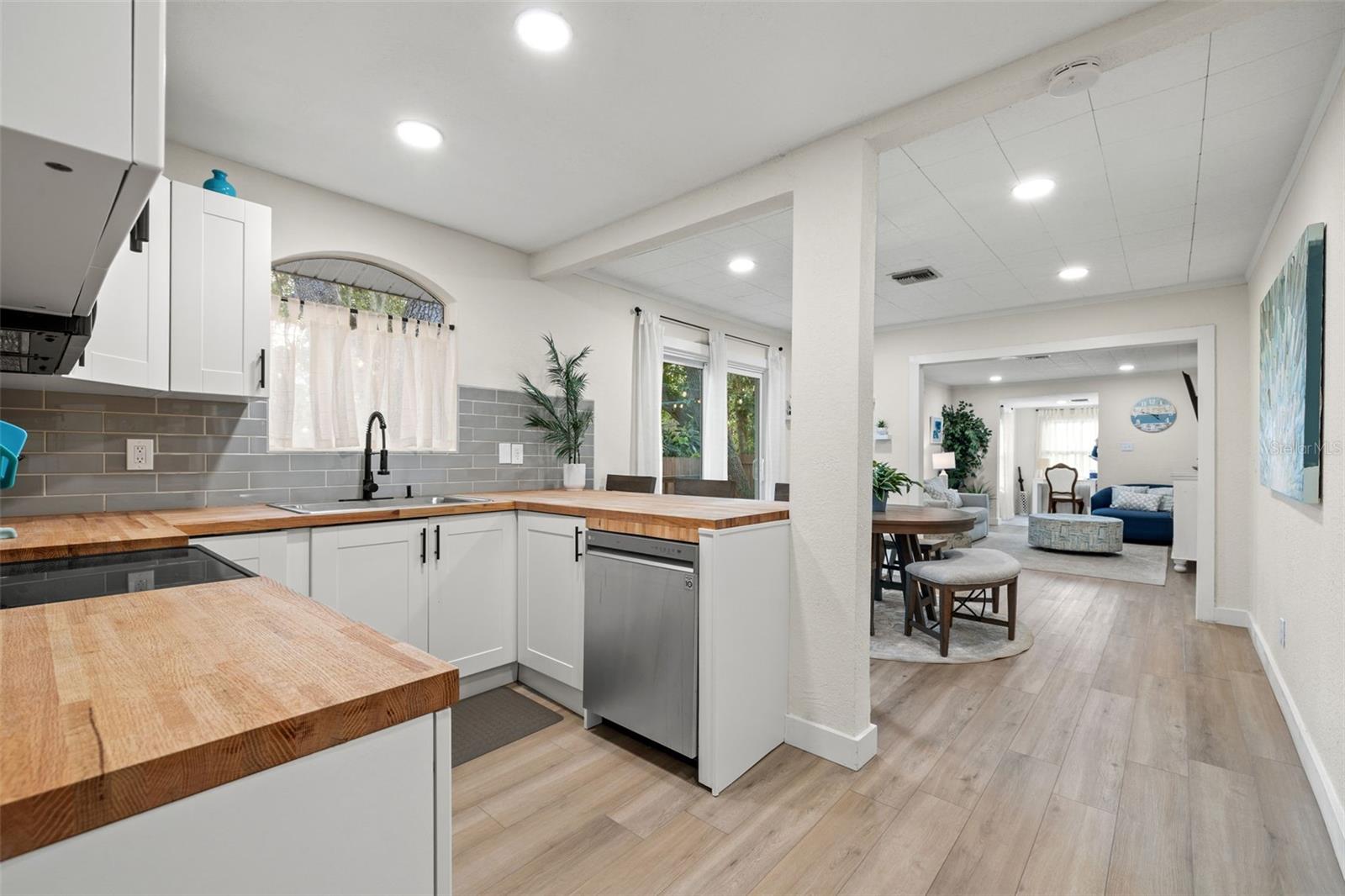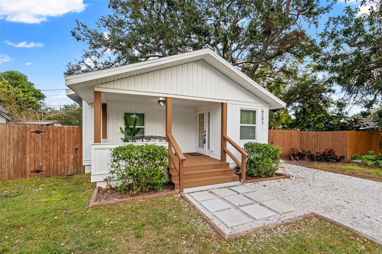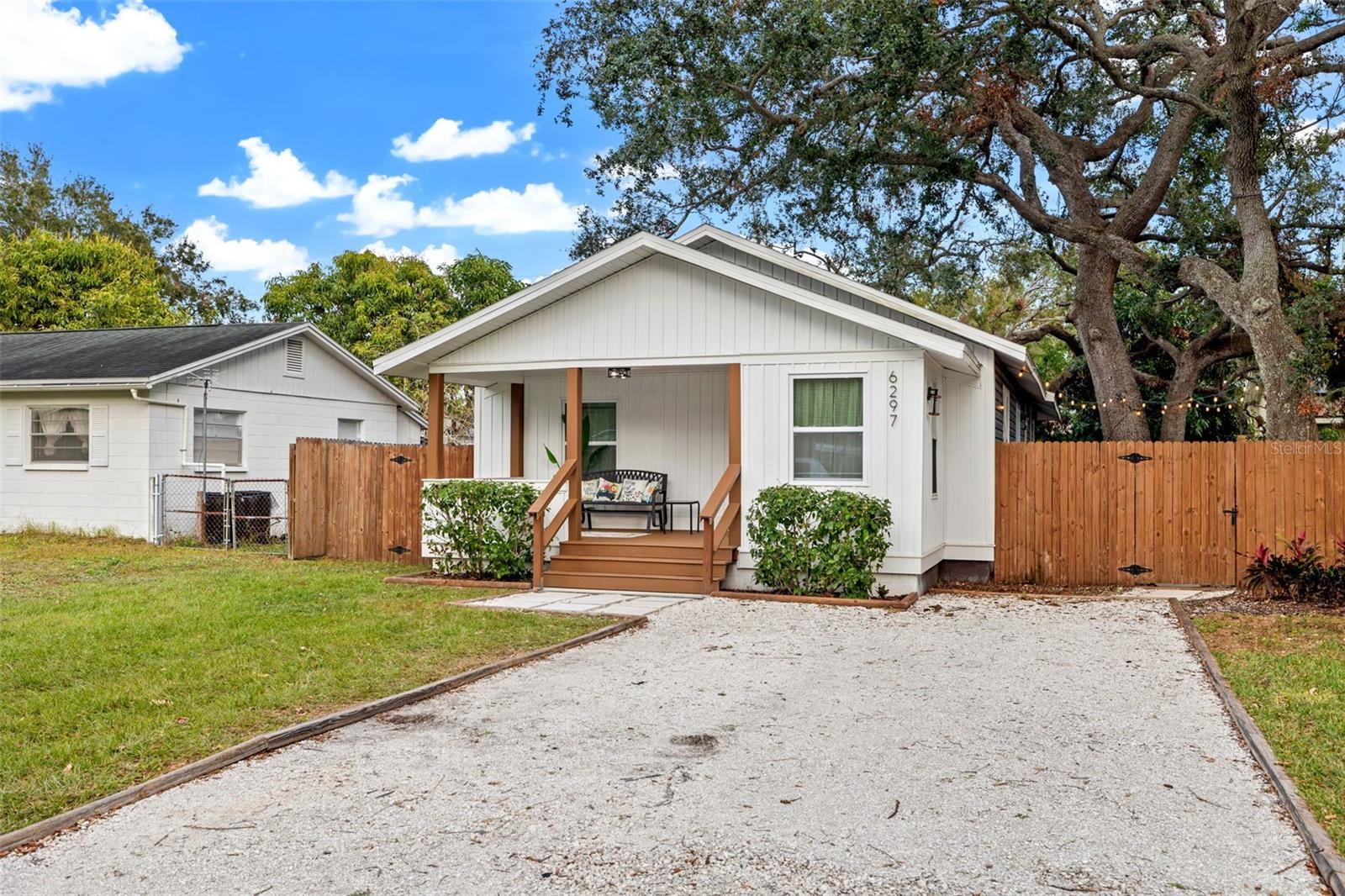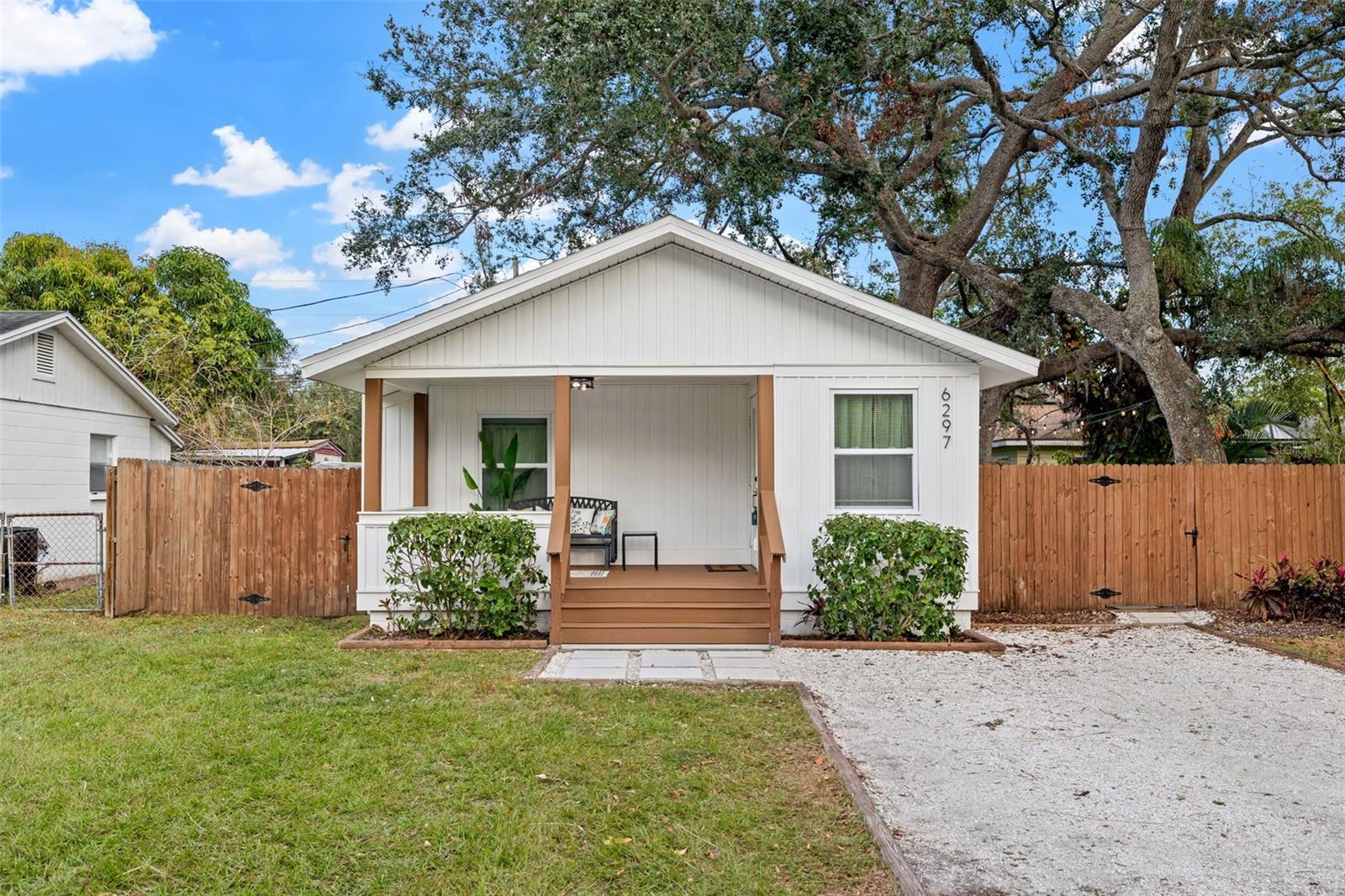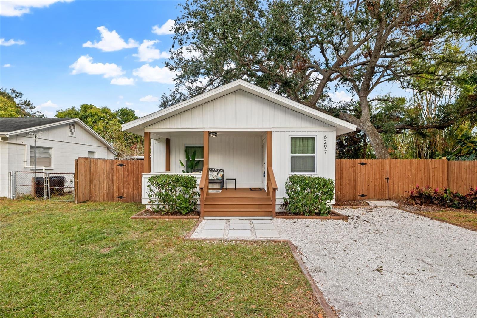 Welcome to 6297 29th St N in North St. Pete! This fully renovated, turnkey 4-bedroom, 2-bathroom bungalow is ready for its next chapter. With nearly 1,500 square feet of thoughtfully designed living space and located in a non-flood zone, this home is a rare find. From the moment you arrive, you'll fall in love with the charming curb appeal, complete with a shell driveway and inviting front porch. Inside, the light-filled, open floor plan seamlessly connects the living room, dining area, and kitchen, creating an ideal space for entertaining and everyday living. The kitchen is a chef's dream, boasting butcher block countertops, abundant cabinetry, a deep stainless-steel sink and a bar seating area. A new 2023 sliding glass door leads to a stylish side deck, perfect for al fresco dining or relaxing outdoors. The split-bedroom floor plan offers privacy and convenience. Two bedrooms and a full bathroom are situated at the front of the home, while the primary suite and a fourth bedroom are tucked towards the back. The primary suite is a true retreat, featuring a custom walk-in closet and an ensuite bath with a shower/tub combo and a spacious vanity. A private exterior door from the primary suite offers the potential for a separate in-law suite or private entrance. This property is not just a perfect home for owner-occupants but also a savvy investment opportunity. Zoned as unincorporated, it allows for short-term rentals, making it an excellent option for Airbnb or other rental platforms. Major upgrades include a new roof (2022), new HVAC system (2022), new flooring, all-new sub flooring, and luxury vinyl plank flooring throughout the home for a modern, durable finish. Don't miss your chance to own this exceptional property that blends modern comforts with timeless charm and outstanding investment potential. Schedule your showing today and make 6297 29th St N your new address!
