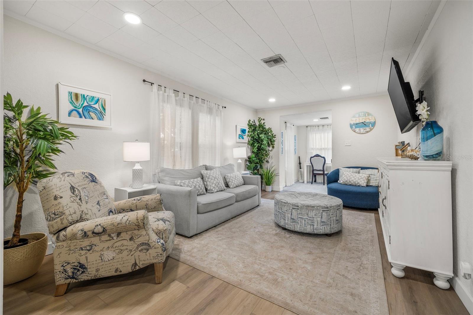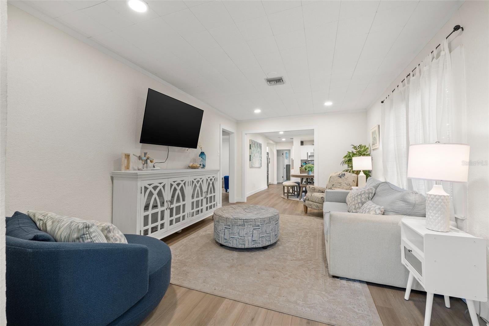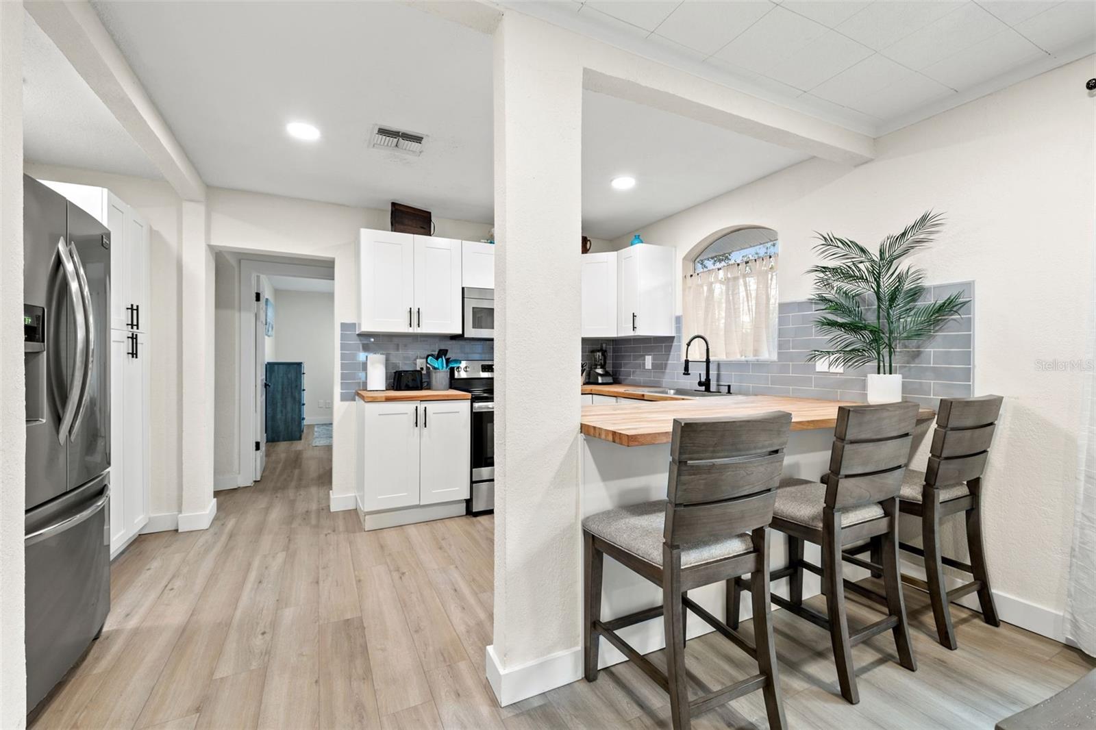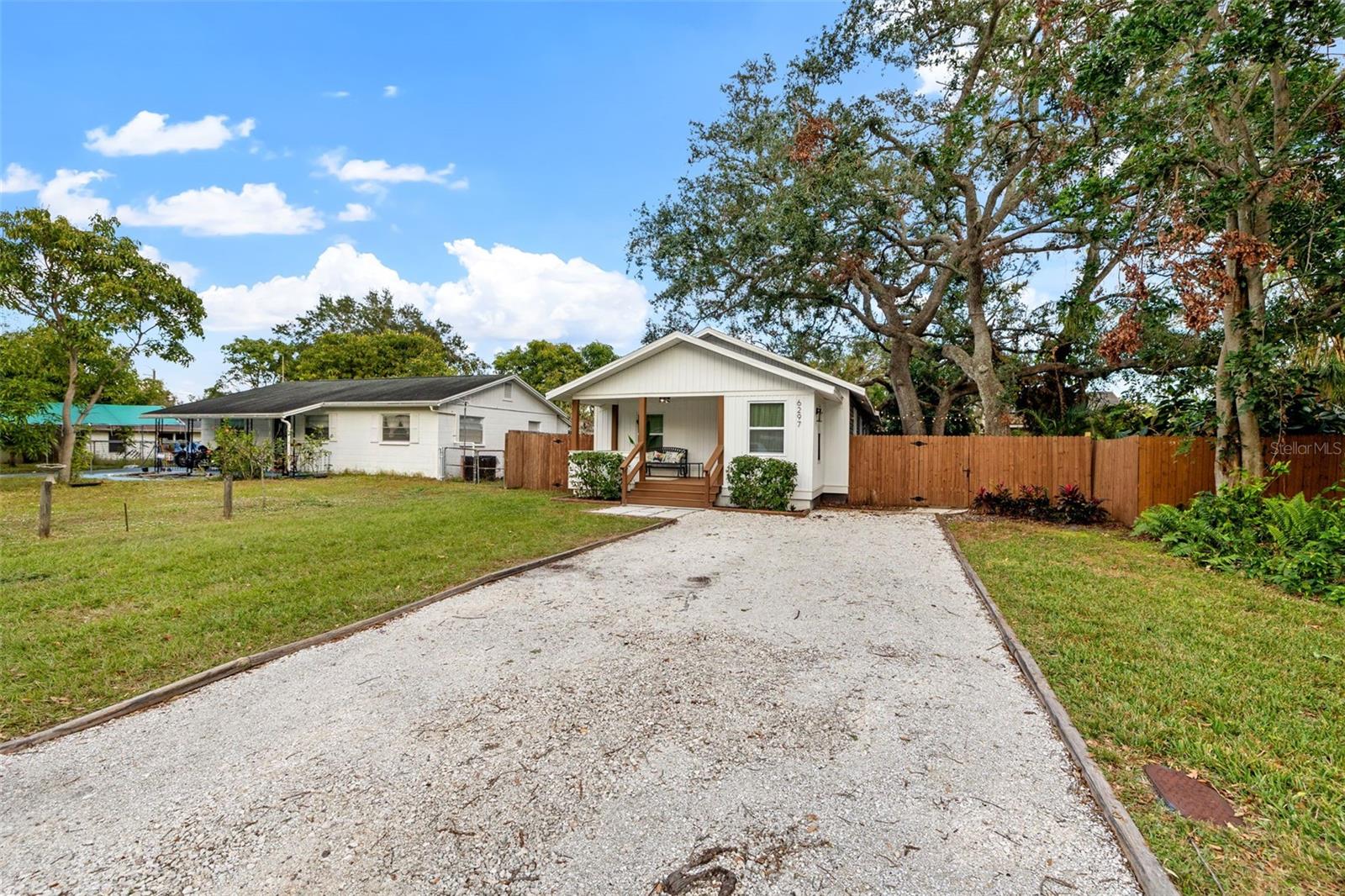 Welcome to 6297 29th St N in North St. Pete! This fully renovated, turnkey 4-bedroom, 2-bathroom bungalow is ready for its next chapter. With nearly 1,500 square feet of thoughtfully designed living space and located in a non-flood zone, this home is a rare find. From the moment you arrive, you'll fall in love with the charming curb appeal, complete with a shell driveway and inviting front porch. Inside, the light-filled, open floor plan seamlessly connects the living room, dining area, and kitchen, creating an ideal space for entertaining and everyday living. The kitchen is a chef's dream, boasting butcher block countertops, abundant cabinetry, a deep stainless-steel sink and a bar seating area. A new 2023 sliding glass door leads to a stylish side deck, perfect for al fresco dining or relaxing outdoors. The split-bedroom floor plan offers privacy and convenience. Two bedrooms and a full bathroom are situated at the front of the home, while the primary suite and a fourth bedroom are tucked towards the back. The primary suite is a true retreat, featuring a custom walk-in closet and an ensuite bath with a shower/tub combo and a spacious vanity. A private exterior door from the primary suite offers the potential for a separate in-law suite or private entrance. This property is not just a perfect home for owner-occupants but also a savvy investment opportunity. Zoned as unincorporated, it allows for short-term rentals, making it an excellent option for Airbnb or other rental platforms. Major upgrades include a new roof (2022), new HVAC system (2022), new flooring, all-new sub flooring, and luxury vinyl plank flooring throughout the home for a modern, durable finish. Don't miss your chance to own this exceptional property that blends modern comforts with timeless charm and outstanding investment potential. Schedule your showing today and make 6297 29th St N your new address!