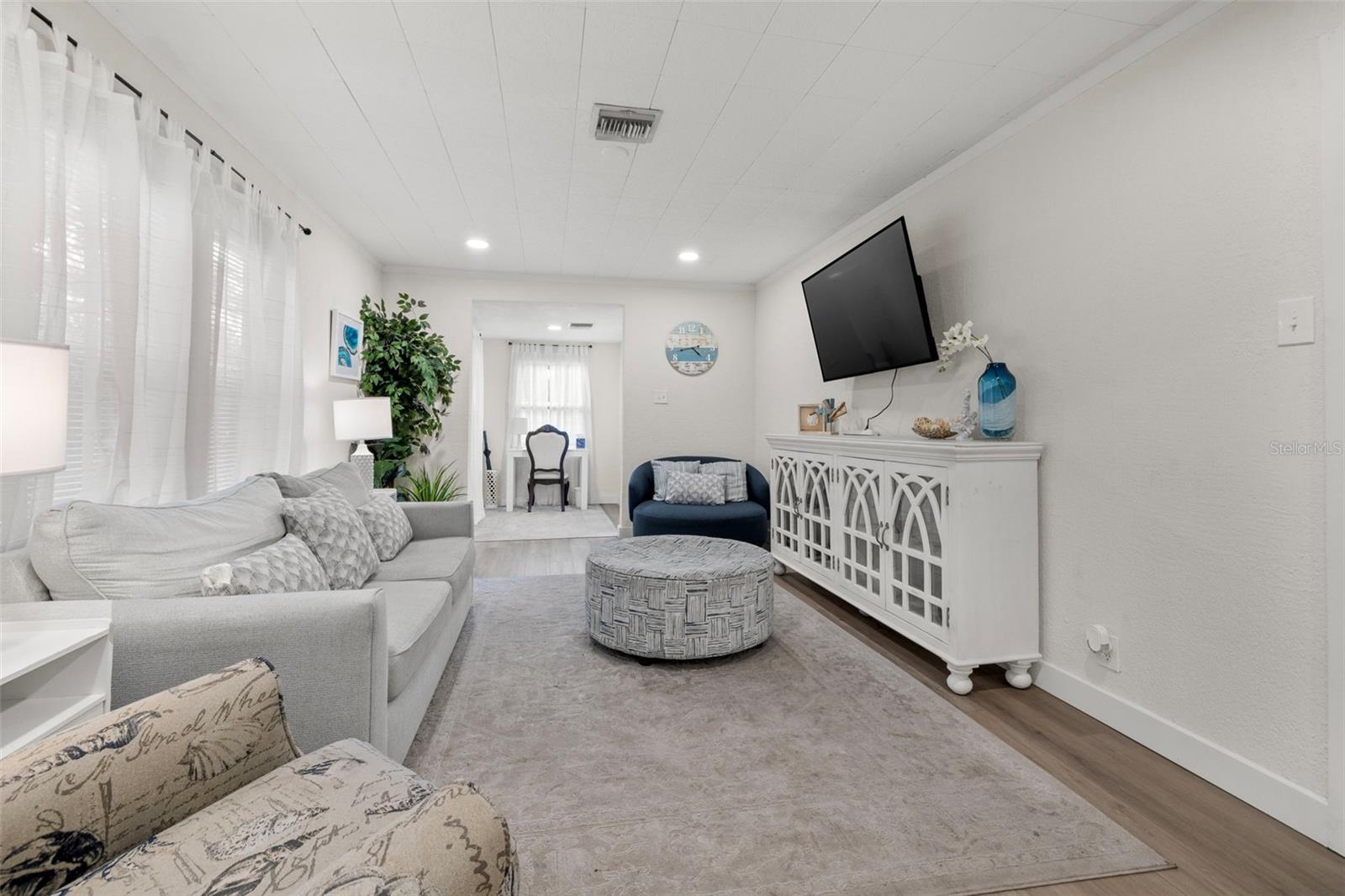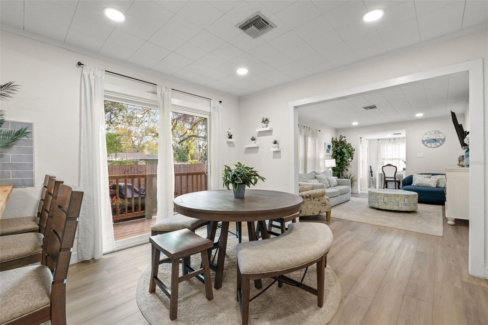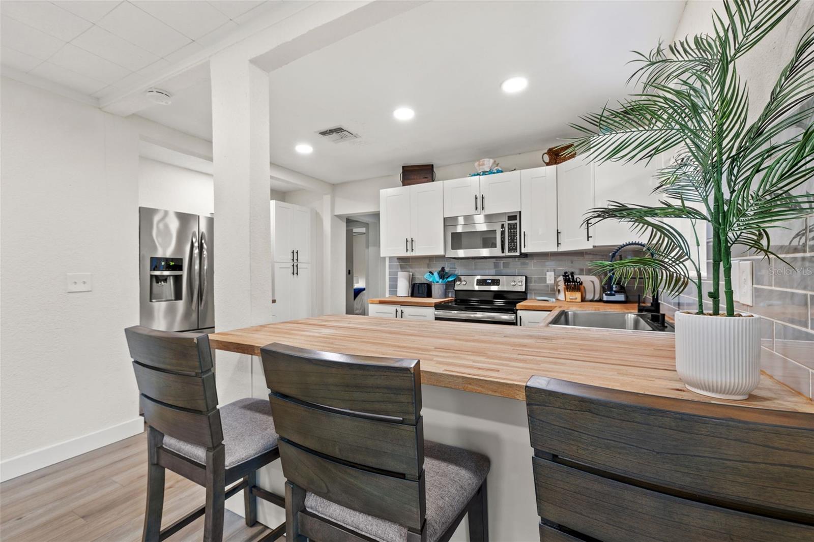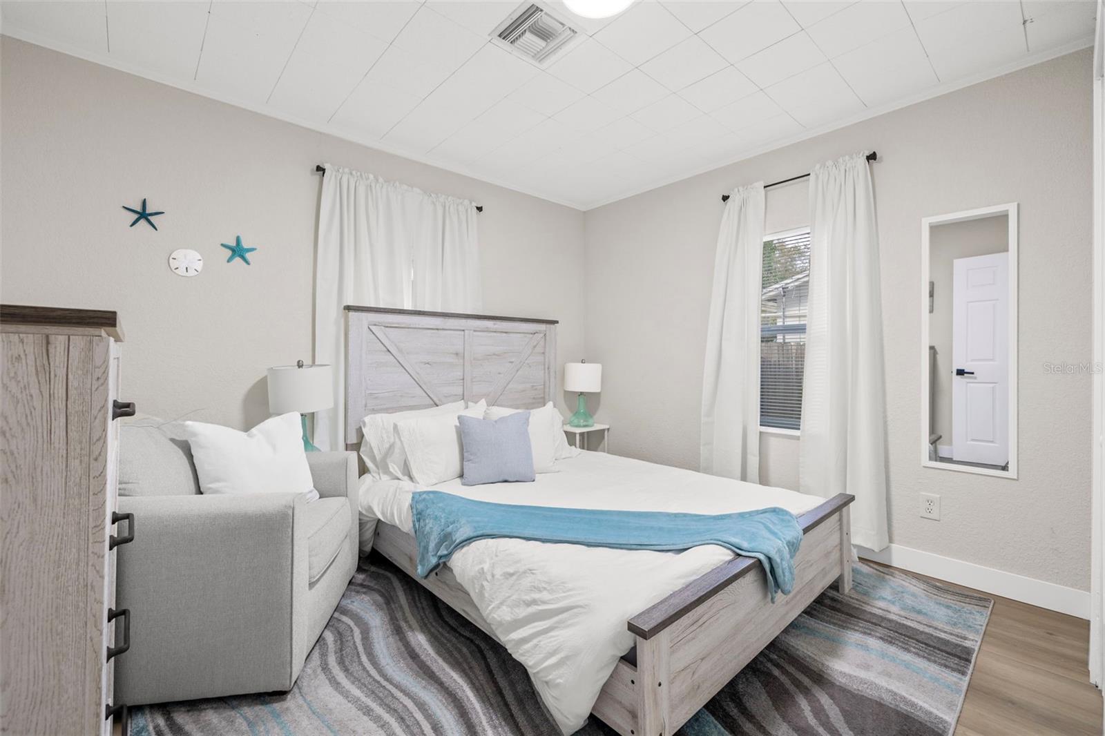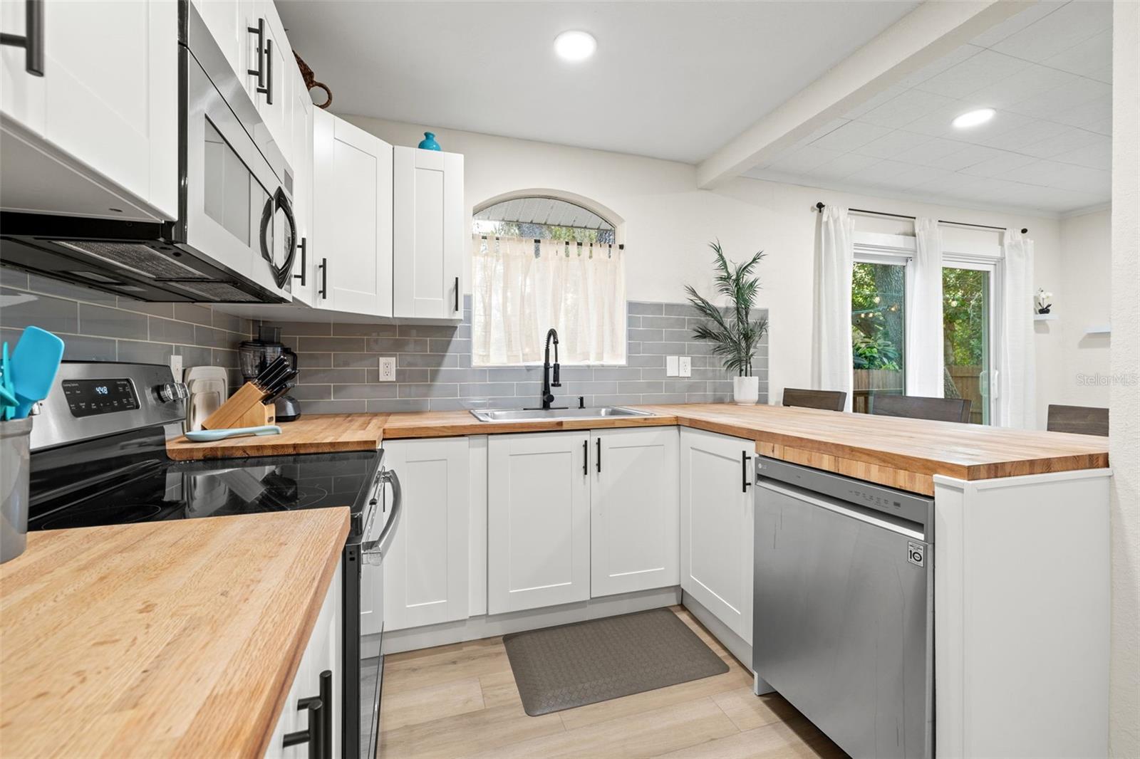 Welcome to 6297 29th St N in North St. Pete! This fully renovated, turnkey 4-bedroom, 2-bathroom bungalow is ready for its next chapter. With nearly 1,500 square feet of thoughtfully designed living space and located in a non-flood zone, this home is a rare find. From the moment you arrive, you'll fall in love with the charming curb appeal, complete with a shell driveway and inviting front porch. Inside, the light-filled, open floor plan seamlessly connects the living room, dining area, and kitchen, creating an ideal space for entertaining and everyday living. The kitchen is a chef's dream, boasting butcher block countertops, abundant cabinetry, a deep stainless-steel sink and a bar seating area. A new 2023 sliding glass door leads to a stylish side deck, perfect for al fresco dining or relaxing outdoors. The split-bedroom floor plan offers privacy and convenience. Two bedrooms and a full bathroom are situated at the front of the home, while the primary suite and a fourth bedroom are tucked towards the back. The primary suite is a true retreat, featuring a custom walk-in closet and an ensuite bath with a shower/tub combo and a spacious vanity. A private exterior door from the primary suite offers the potential for a separate in-law suite or private entrance. This property is not just a perfect home for owner-occupants but also a savvy investment opportunity. Zoned as unincorporated, it allows for short-term rentals, making it an excellent option for Airbnb or other rental platforms. Major upgrades include a new roof (2022), new HVAC system (2022), new flooring, all-new sub flooring, and luxury vinyl plank flooring throughout the home for a modern, durable finish. Don't miss your chance to own this exceptional property that blends modern comforts with timeless charm and outstanding investment potential. Schedule your showing today and make 6297 29th St N your new address!