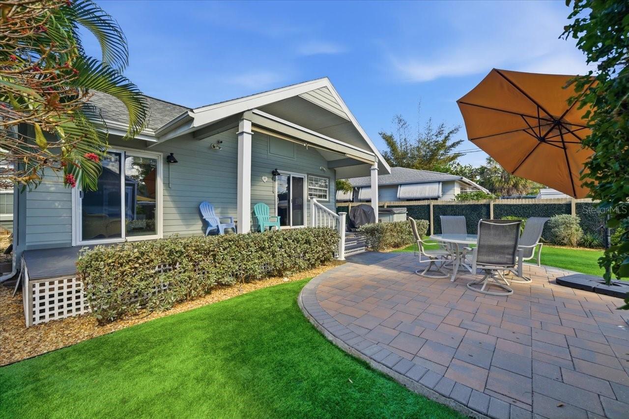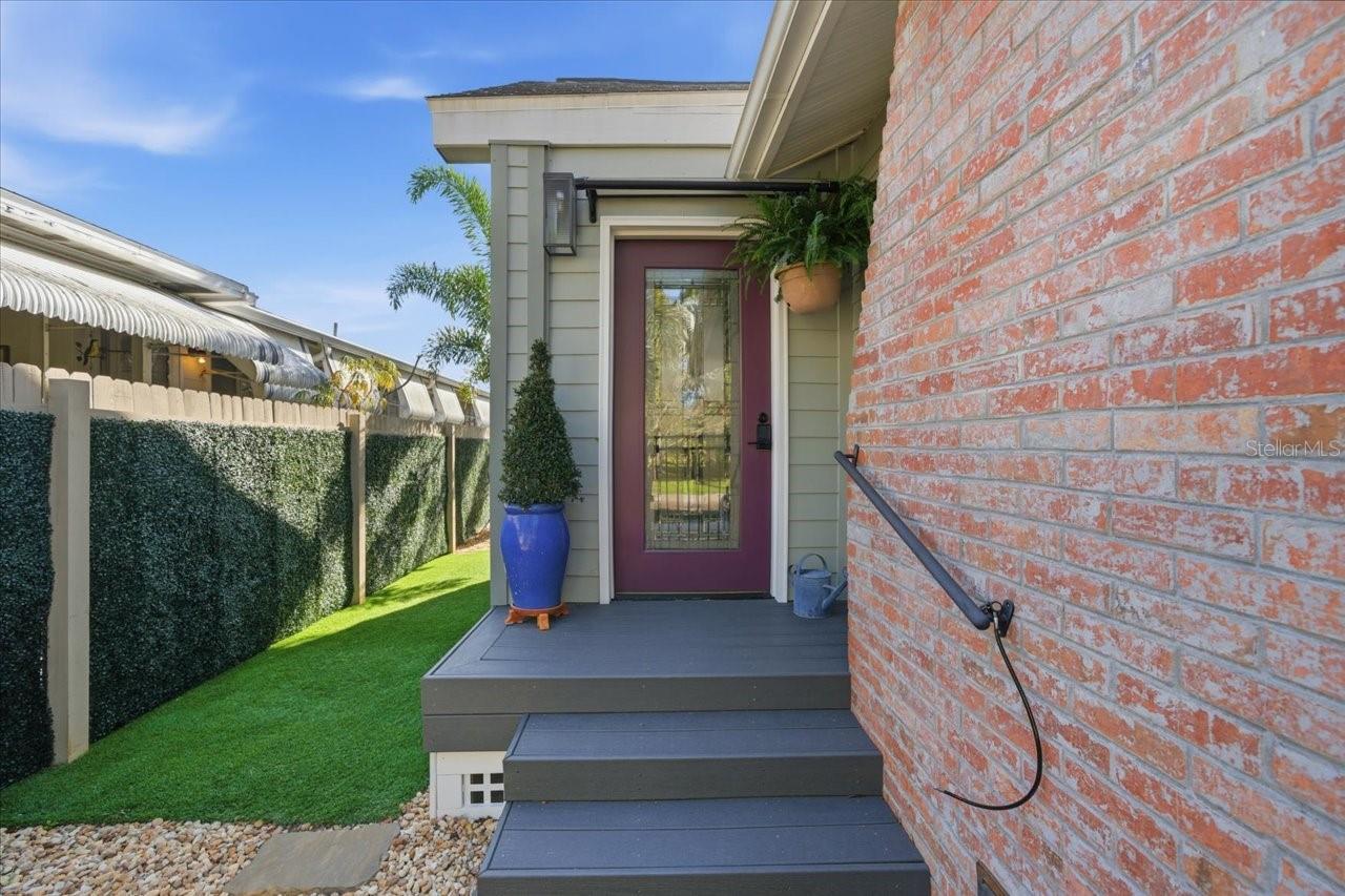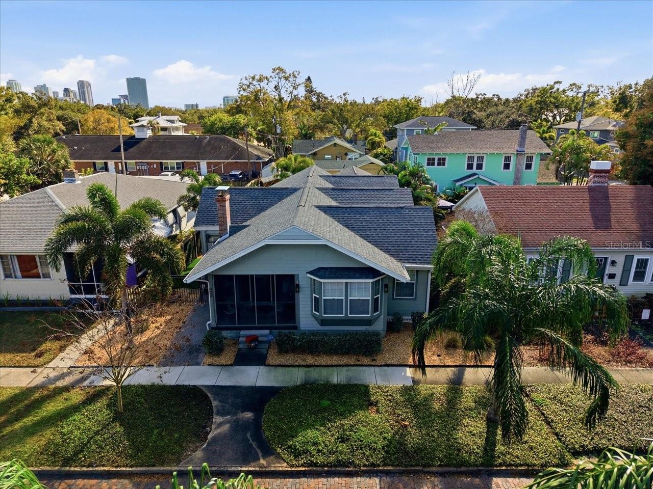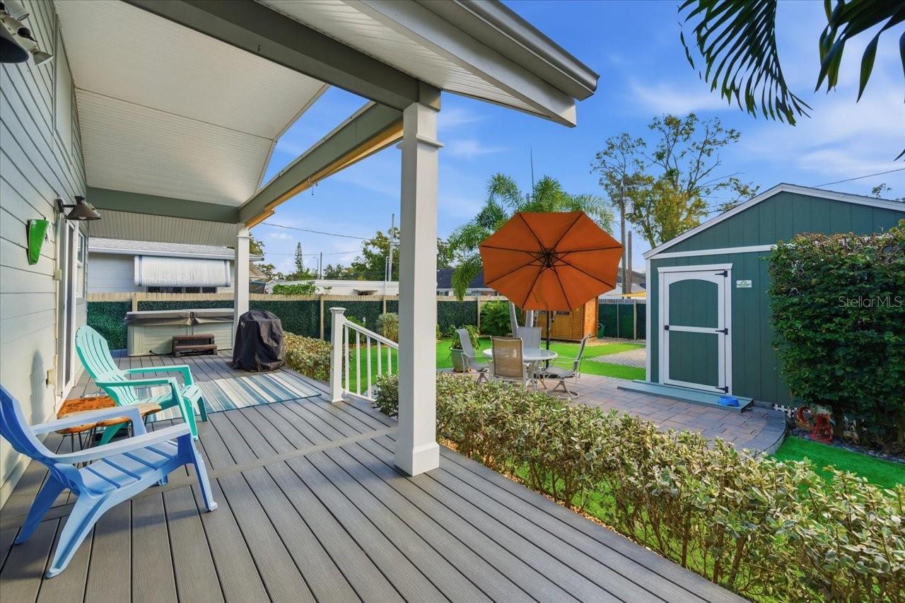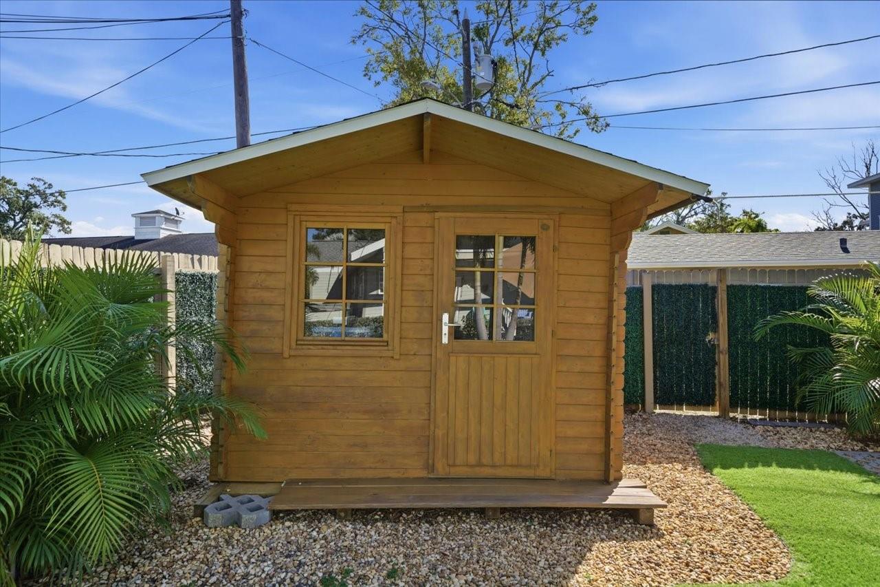 Welcome to a home where every detail has been thoughtfully reimagined. Your experience begins at the stylish new entry, featuring a hurricane-rated door (2024) and side-panel window. The original entryway has been cleverly transformed into a private screened-in patio, perfect for peaceful morning coffees. Step inside to find a light-filled living room boasting vaulted ceilings and the home's original wood-burning fireplace. To your left, the guest suite is a showstopper with its own vaulted ceilings and a massive bay window with a deep ledge--ideal for a reading nook or a plant lover's paradise. This room maximizes space with a built-in Murphy bed and an oversized walk-in closet. The heart of the home is the stunning kitchen, featuring farmhouse-style aesthetics and an island centerpiece. The granite countertops have been expertly finished with epoxy, providing a designer look that's easy to maintain. Nearby, the massive primary suite serves as a true retreat, featuring a spa-like bath with a jetted tub, walk-in shower, and dual sinks. Step through new sliding glass doors (2024), either from the kitchen or the primary bedroom, into your own private backyard oasis. Designed for low-maintenance luxury, the yard features turf, pavers all surrounded by live greenery kept lush by a Rain Bird micro-irrigation system. Relax on the deck under custom sun shades, soak in the working hot tub, or utilize the gorgeous hand-built Norwegian Spruce shed. Located in an ADU-friendly neighborhood with alley access, this property offers the rare potential to build an additional dwelling unit. With a 2021 garage with a workbench, and a reinforced turf-lock parking pad, this home is as smart as it is beautiful.